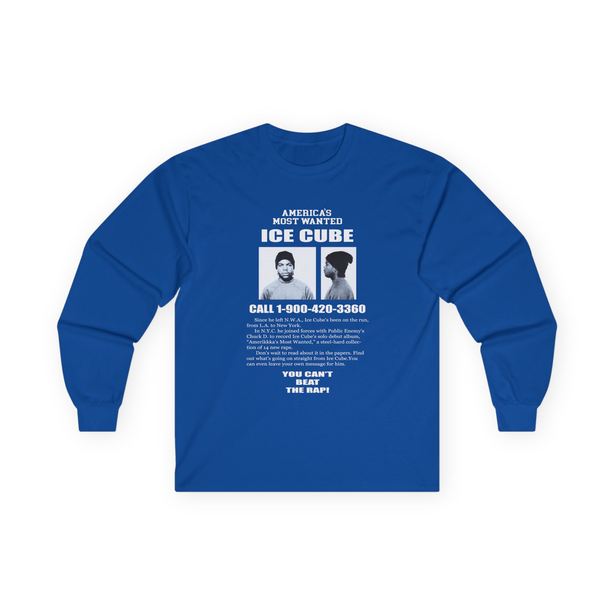 A bit more formal than a standard-issue t-shirt, the Ice Cube America's Most Wanted ultra cotton long sleeve tee is a clear comfort winner. The sleeves also act as a nice frame. There are no side seams. The shoulders are taped for improved durability. This makes for a good fitting around the shoulders and neck. The cotton used for these shirts is environmentally friendly.
