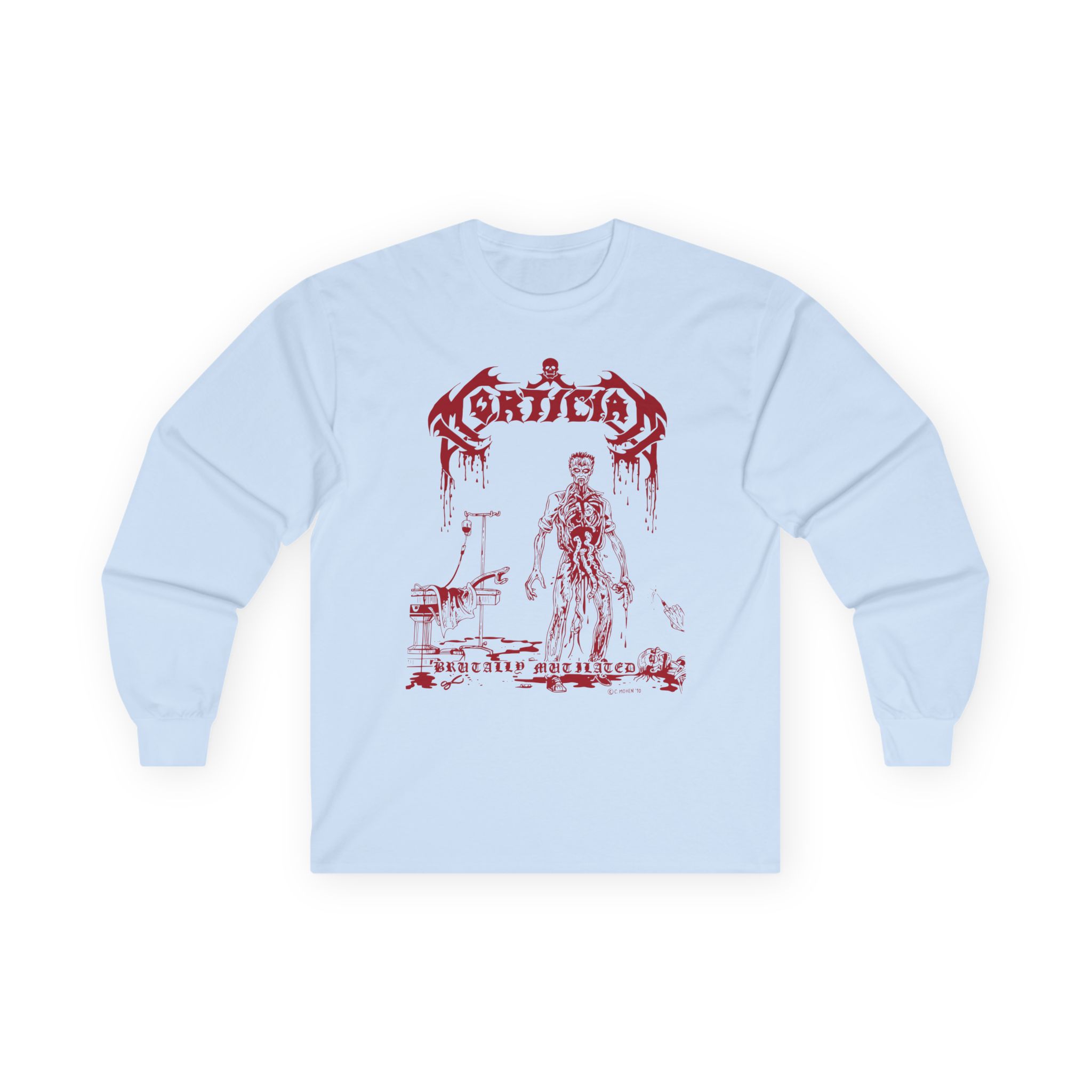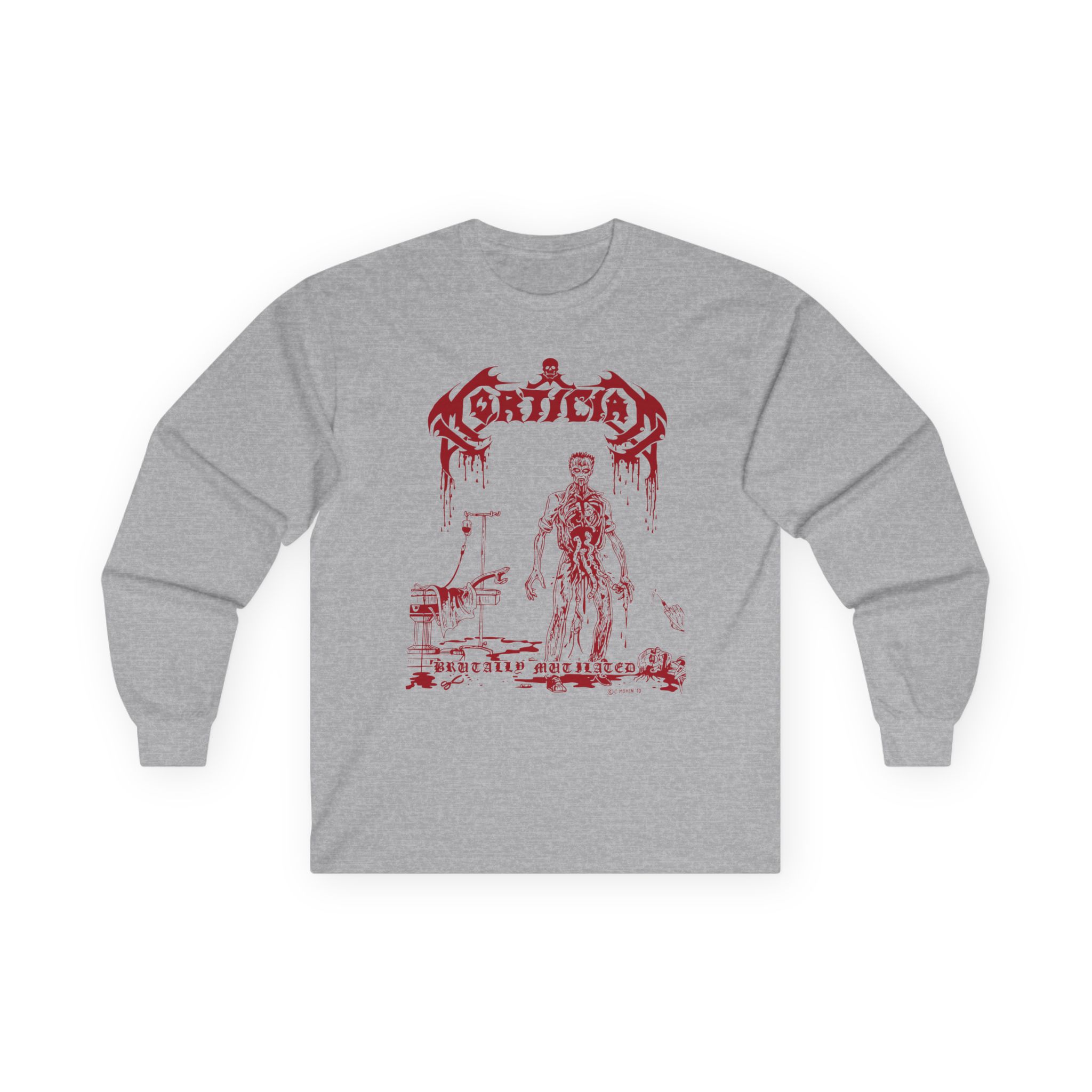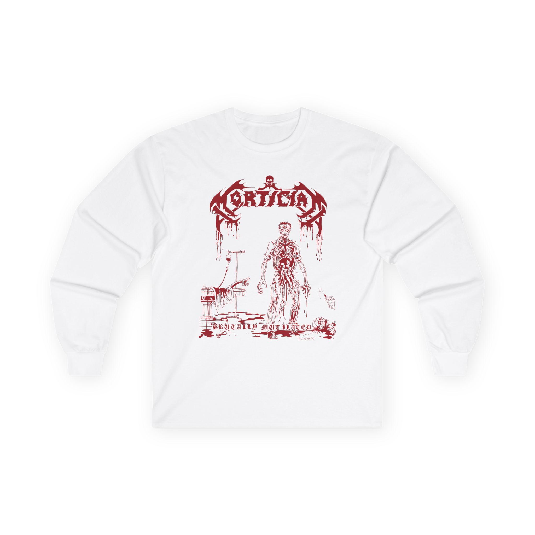 A bit more formal than a standard-issue t-shirt, the Mortician Brutally Mutilated ultra cotton long sleeve tee is a clear comfort winner. The sleeves also act as a nice frame. There are no side seams. The shoulders are taped for improved durability. This makes for a good fitting around the shoulders and neck. The cotton used for these shirts is environmentally friendly.